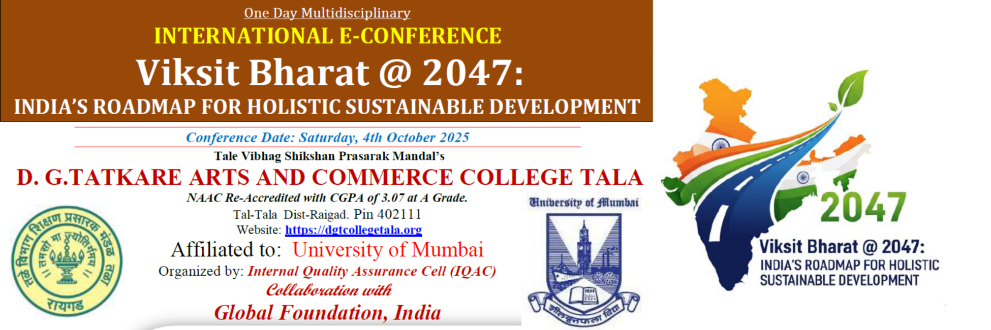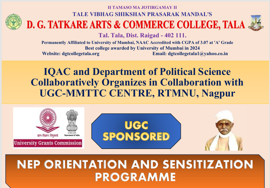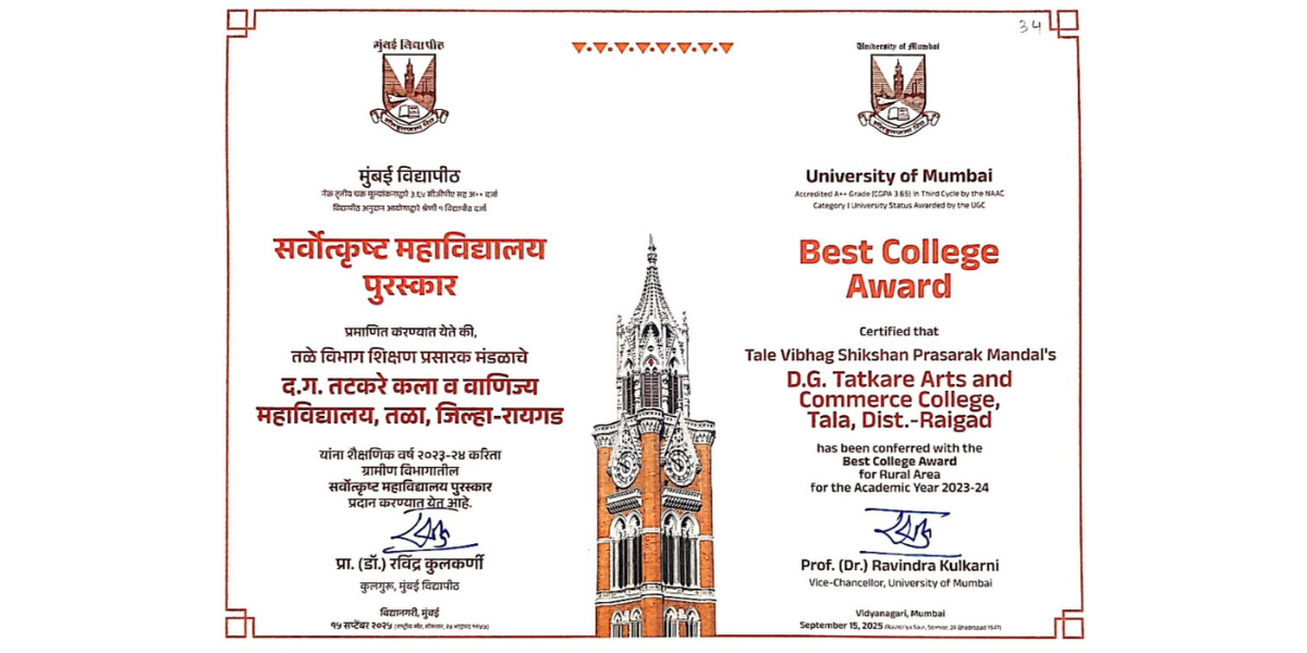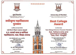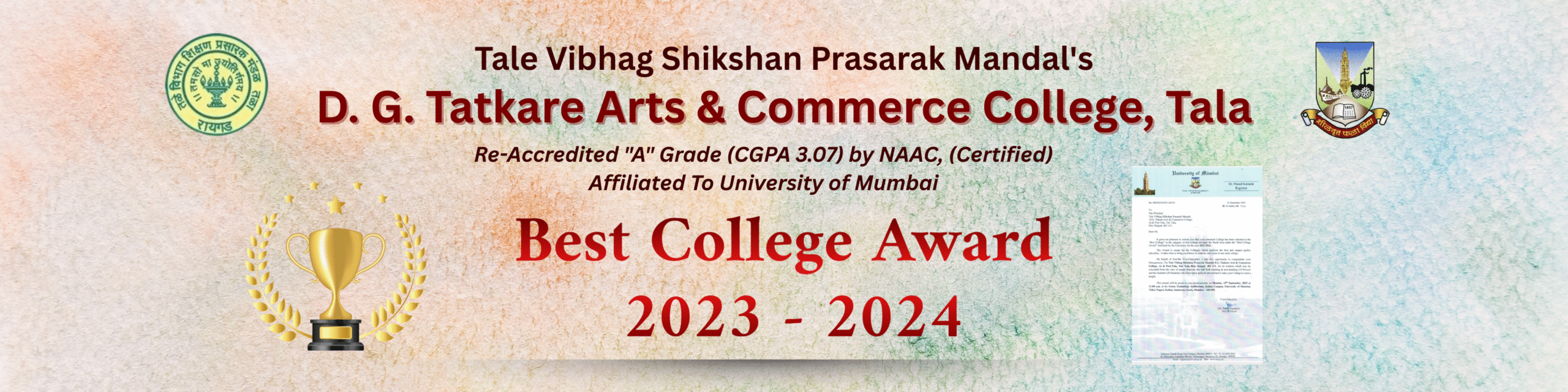 Welcome to D.G. Tatkare Arts and Commerce College, Tala, an institution managed by the Tale Vibhag Shikshan Prasarak Mandal. Our college is permanently affiliated to the University of Mumbai and recognized by the UGC. With its commitment to excellence, the college has earned an ‘A’ Grade in the NAAC Reaccreditation, establishing itself as a center of quality education in the rural region.