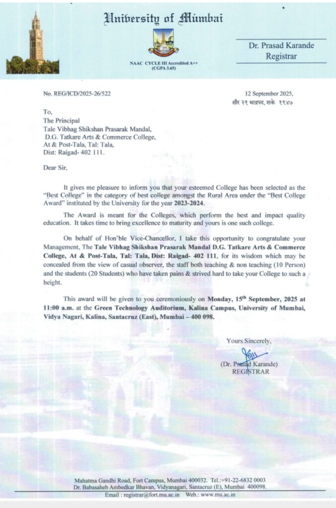 Tal. Tala, Dist - Raigad - 402111 02140-269575, 9273499354, dgtcollegetala1@yahoo.co.in
