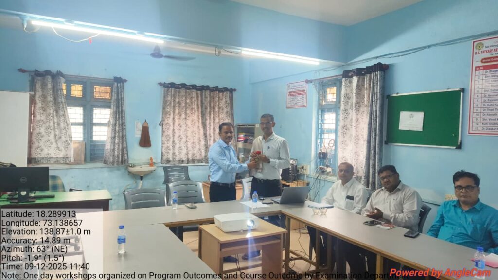 A one-day workshop on “How to prepare Question Papers based on Course Outcomes (COs) and Programme Outcomes (POs) as per the National Education Policy 2020” was organized by the Examination Department of D.G. Tatkare Arts and Commerce College, Tala (Taluka Tala, District Raigad) on Friday, 12 September 2025 at 11:30 a.m. in the college IQAC.